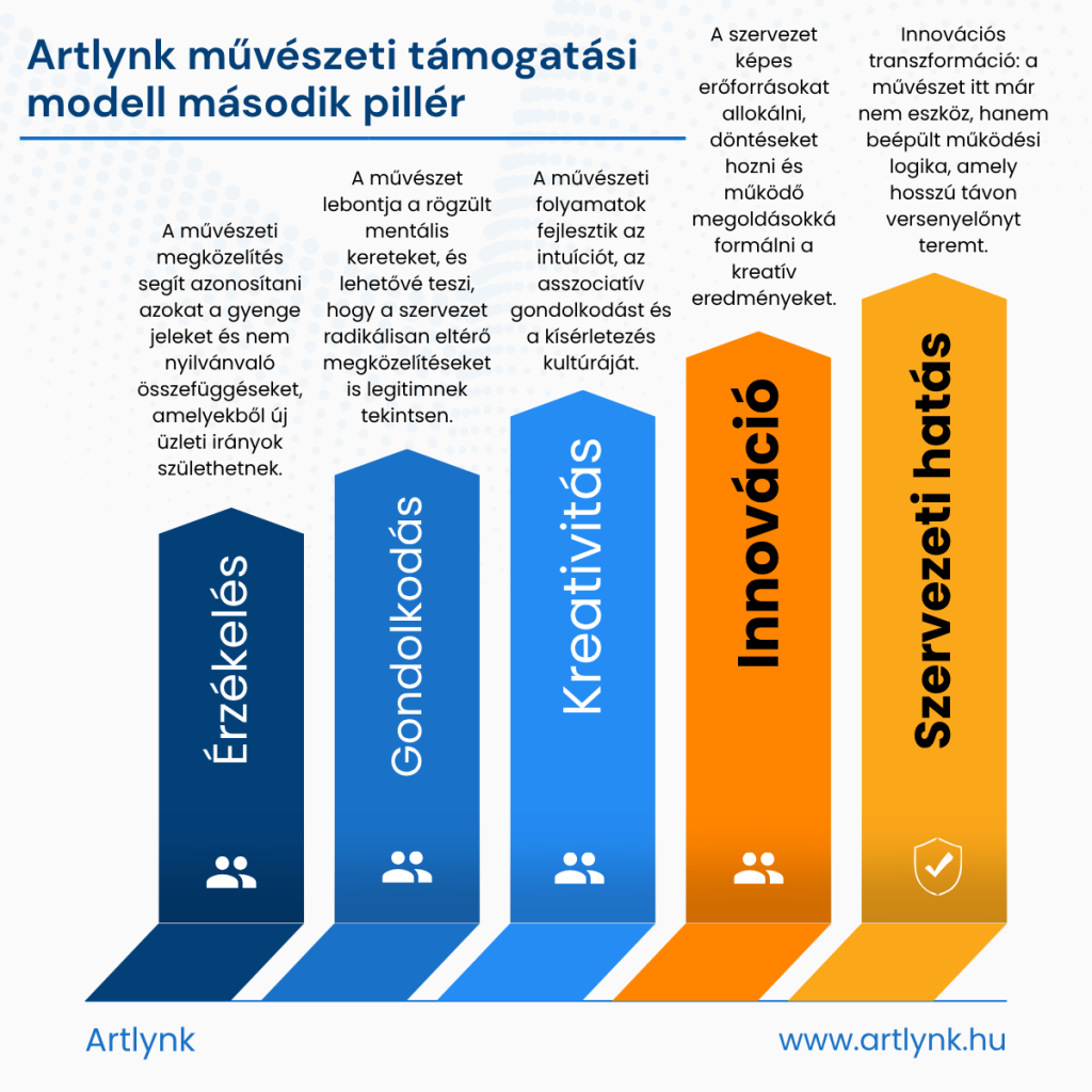 Ez a második pillér már azt mutatja be, hogy a művészeti eszközök a szervezeti működésbe beépülve, a szervezeti innováció növelésével teremtenek versenyelőnyt.